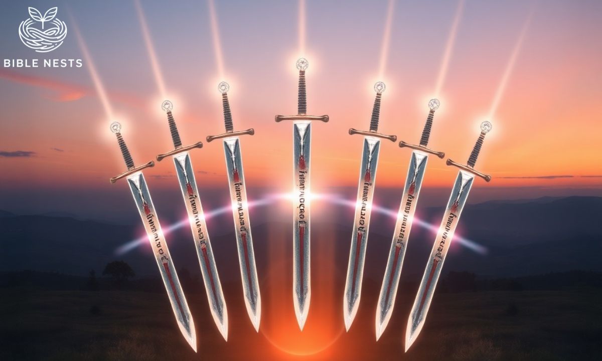Each sword stands for a divine virtue — Humility, Prudence, Patience, Justice, Charity, Temperance, and Fortitude.